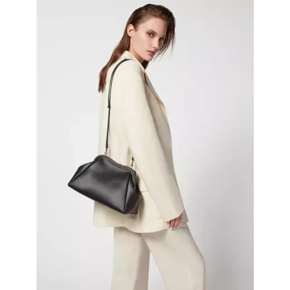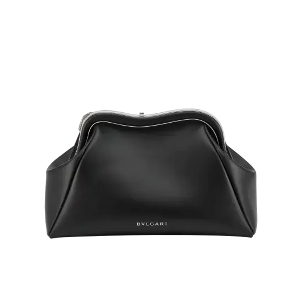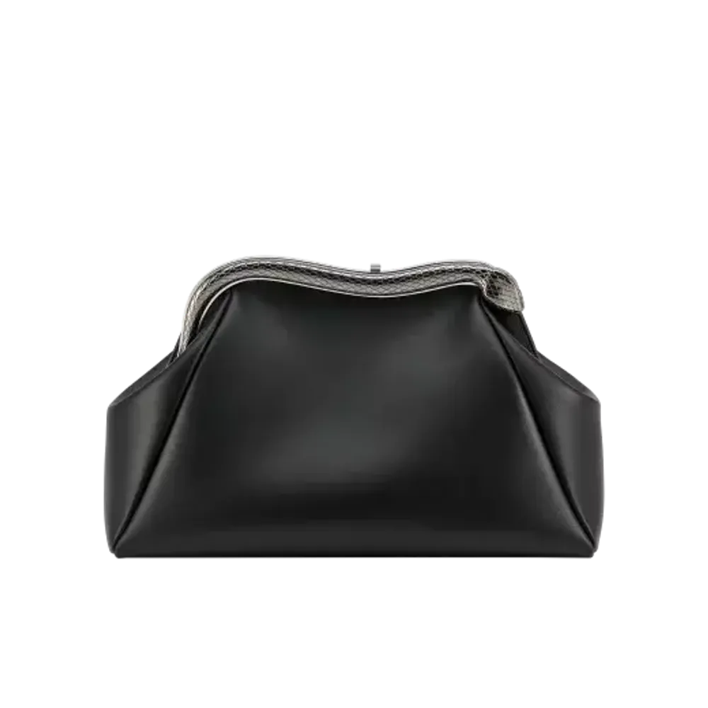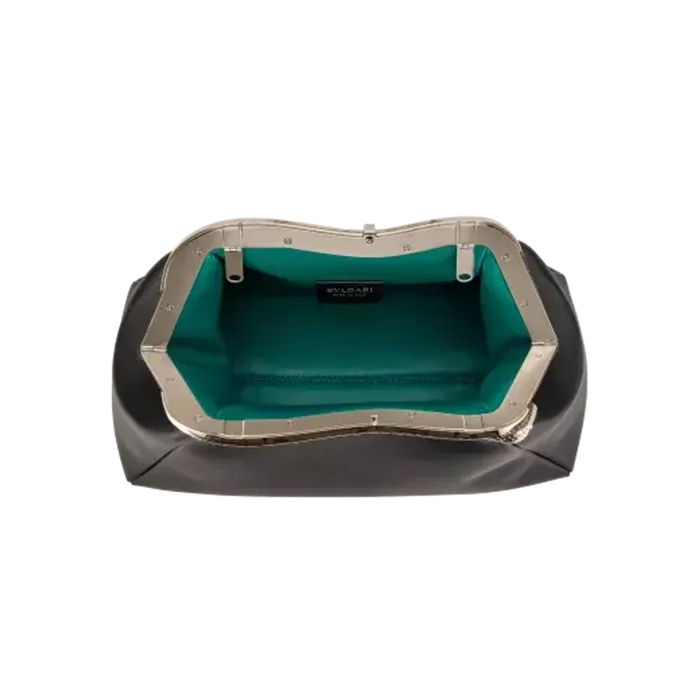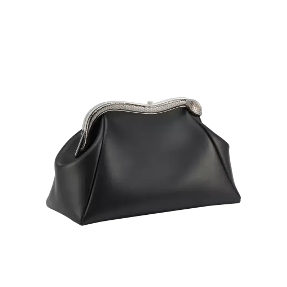 Небольшой клатч Serpentine из черной гладкой телячьей кожи с изумрудно-зеленой подкладкой из кожи наппа. Очаровательная оправа в форме тела змеи из темной латуни с рутениевым напылением, украшенная выгравированными чешуйками и красными эмалевыми глазами с одной стороны и черной вставкой из гладкой телячьей кожи с другой, а также c застежкой на кнопку.