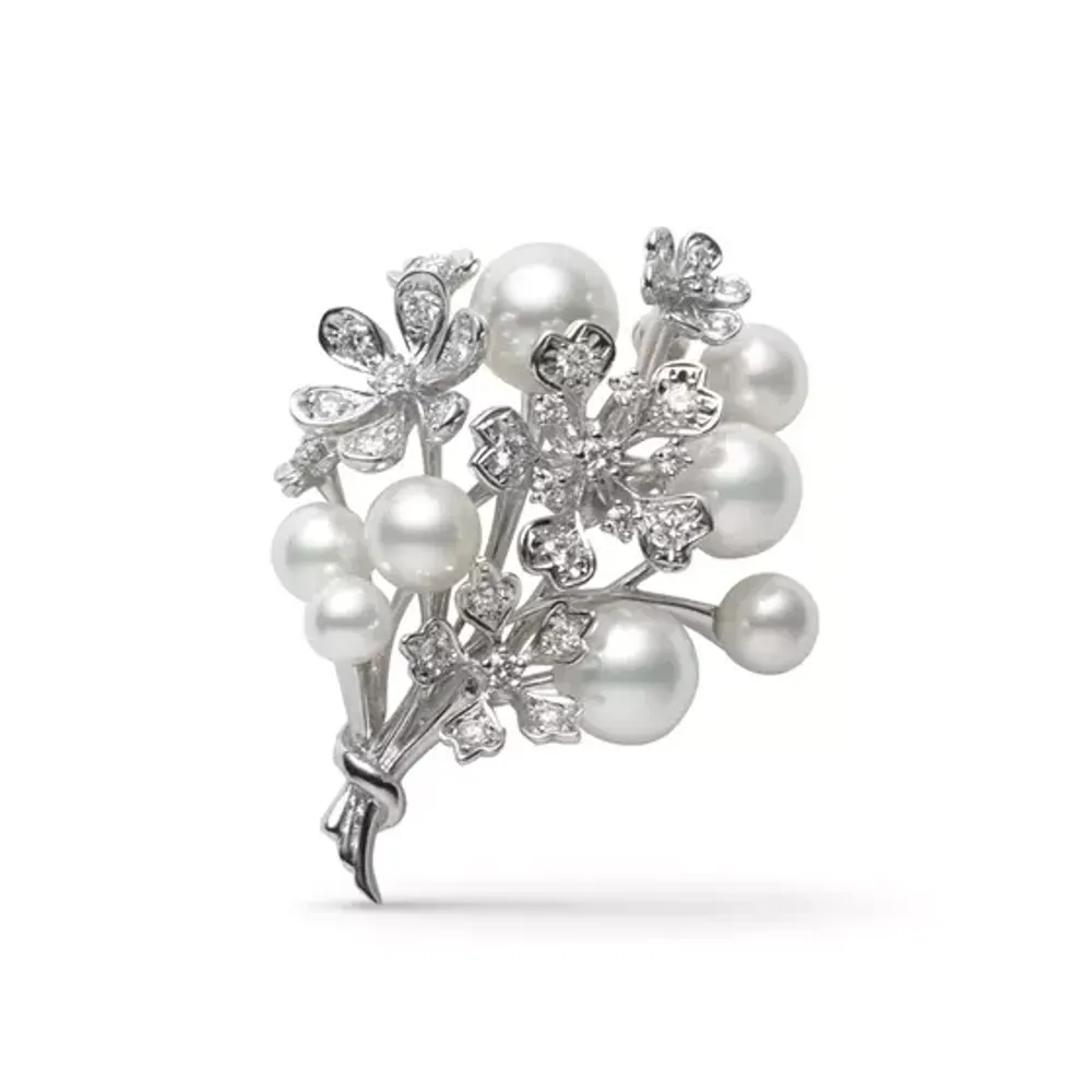 Эти украшения имеют форму распустившихся цветов, переплетенных в кружевной узор. Бриллианты и жемчуг создают изысканный и нежный образ. Эта брошь украшена культивированным жемчугом Akoya размером 4,5x7,5 мм с бриллиантами весом 0,55 карата в оправе из 18-каратного белого золота.