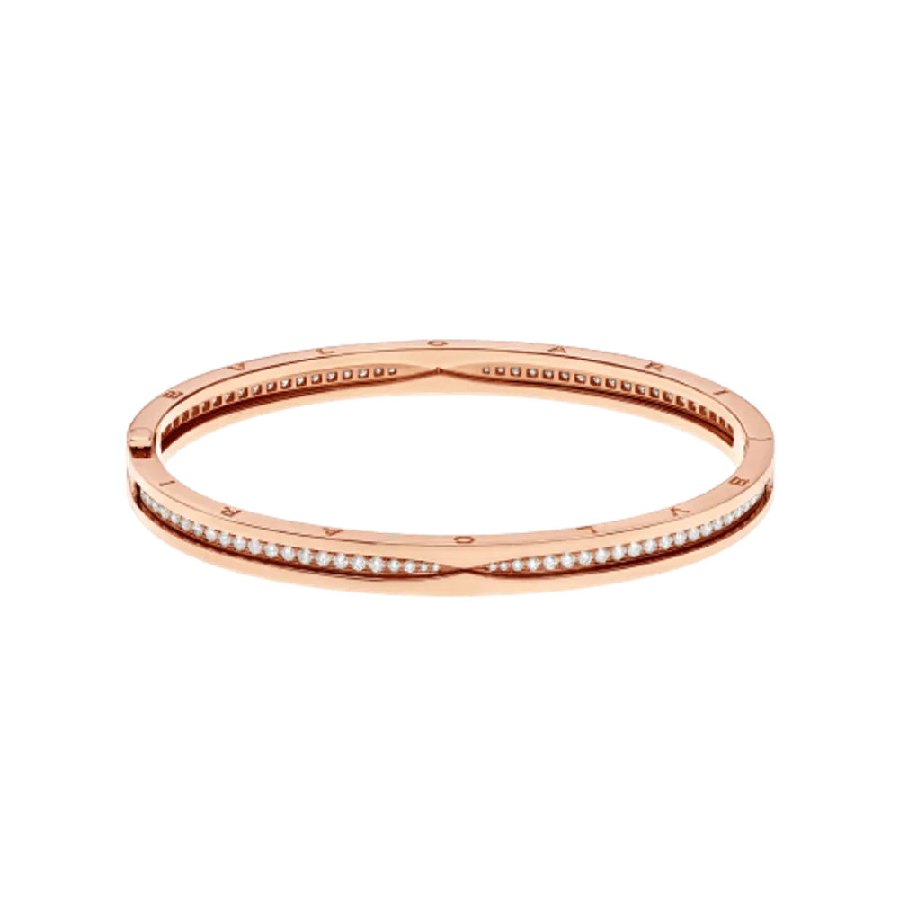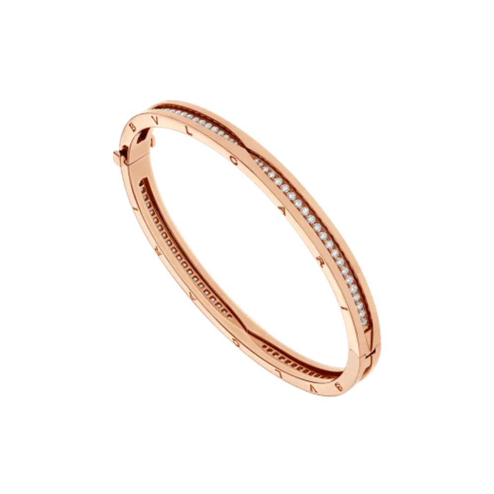 Навеянный самым известным амфитеатром, Колизеем, браслет B.zero1 являет собой истинный манифест творческого видения Дома Bulgari, бросающего вызов устоям ювелирного дизайна. Чистые линии этой выразительной спирали символизируют гармоничную связь прошлого, настоящего и будущего, определяющую величественный облик Вечного города, и служат ярким выражением новаторского духа всей коллекции. Браслет в форме кольца B.zero1, розовое золото, бриллиантовое паве.