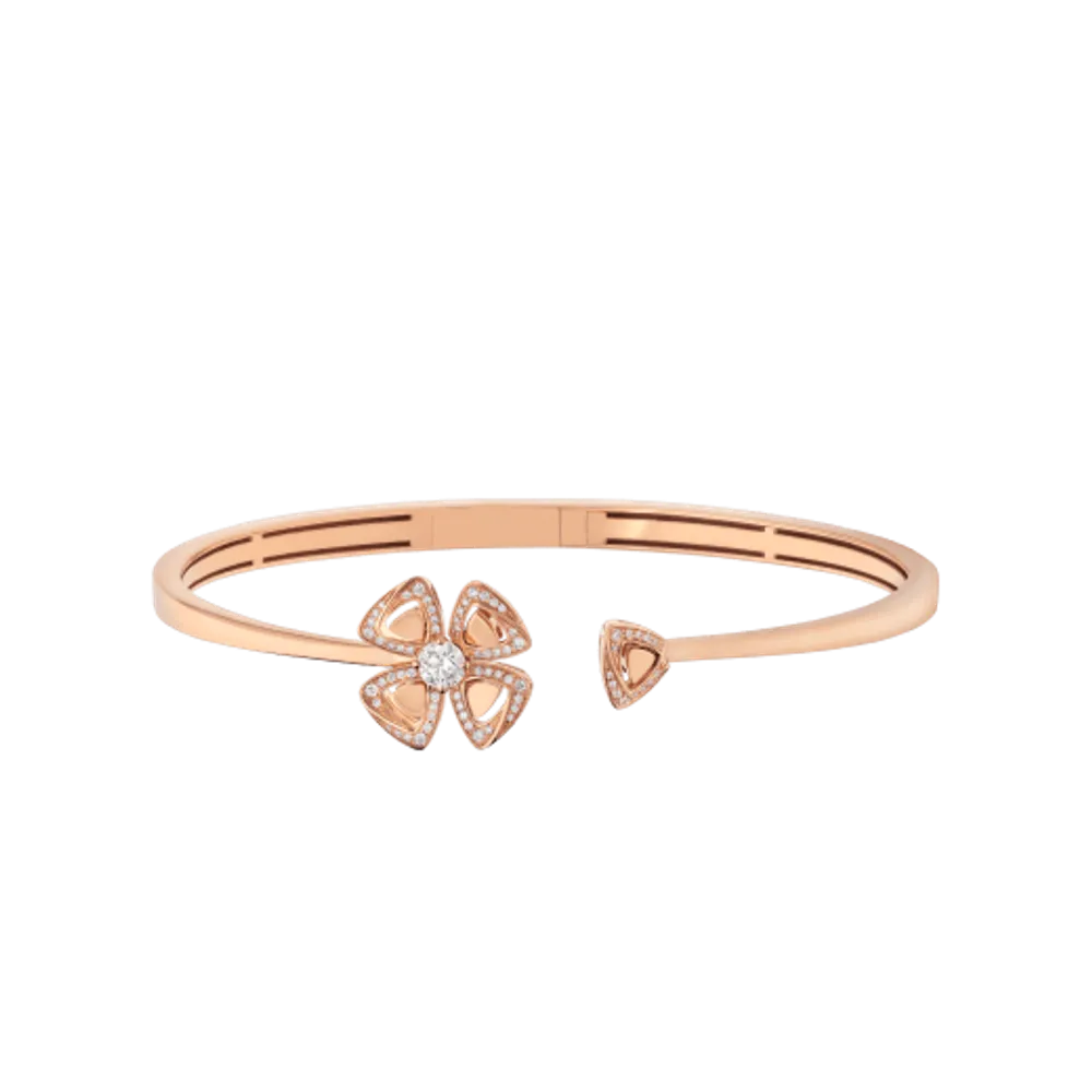 Коллекция Fiorever, распустившаяся среди чудес Вечного города, навеяна прелестным цветком с четырьмя лепестками, издавна почитаемым жителями Рима как символ радости и счастья. Два слова – итальянское «fiore» («цветок») и английское «forever» («навсегда») – сплелись в названии коллекции, воспевающей жизнелюбие римлян и яркий страстный дизайн. Браслет Fiorever с бриллиантовым цветком изящно обвивает запястье, покоряя своим современным силуэтом и немеркнущим сиянием. Дизайн украшения дополняет крошечный лепесток, словно унесенный внезапным порывом ветра. Браслет Fiorever, розовое золото 18 карат, бриллиант, бриллиантовое паве.