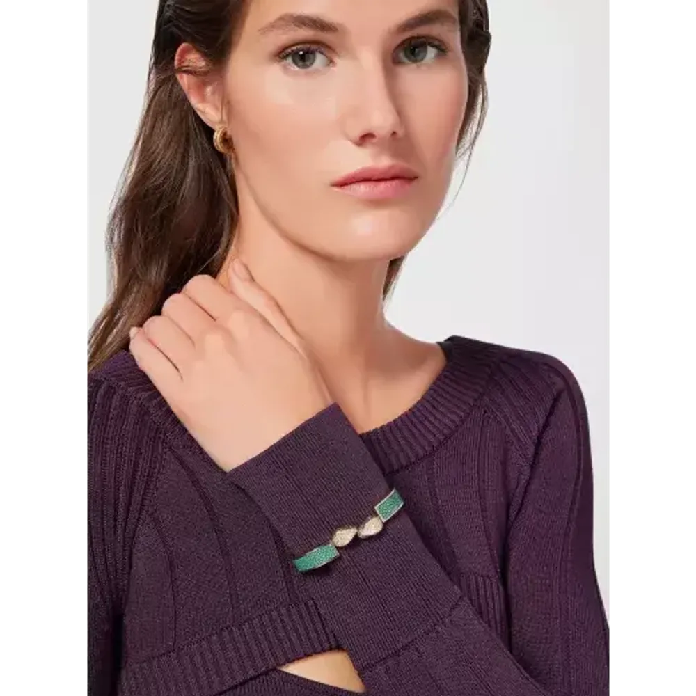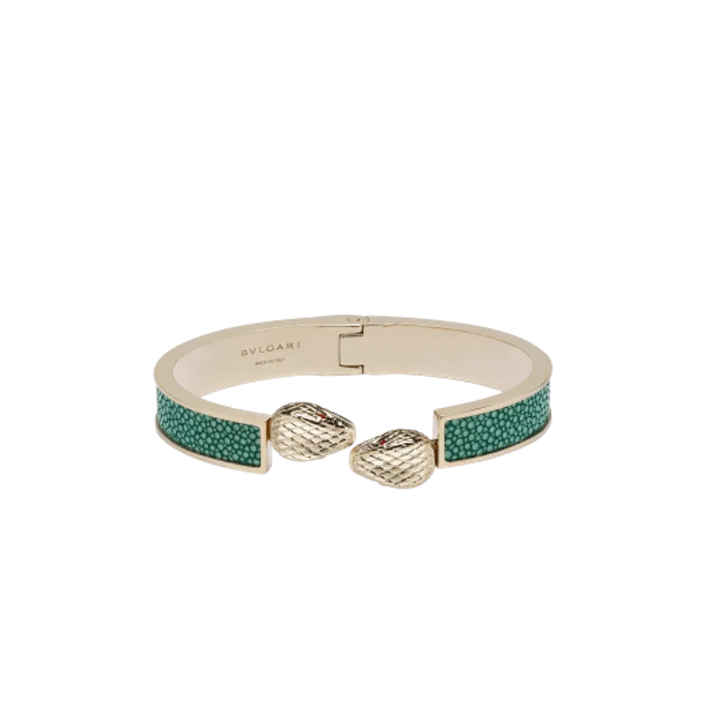 Браслет-бэнгл Serpenti Forever из латуни с покрытием из светлого золота и мягкими вставками из кожи галухат изумрудно-зеленого цвета.