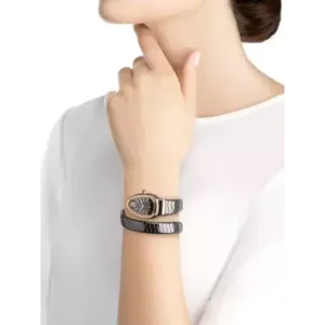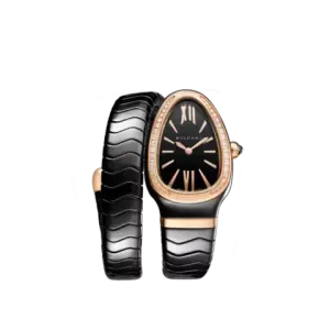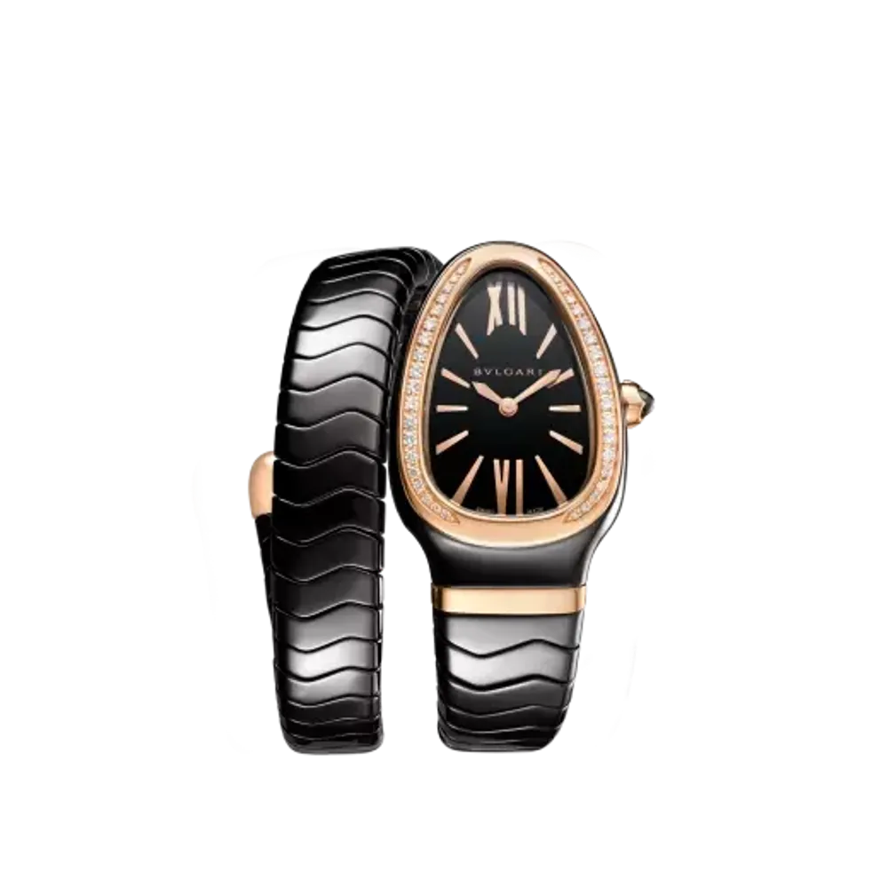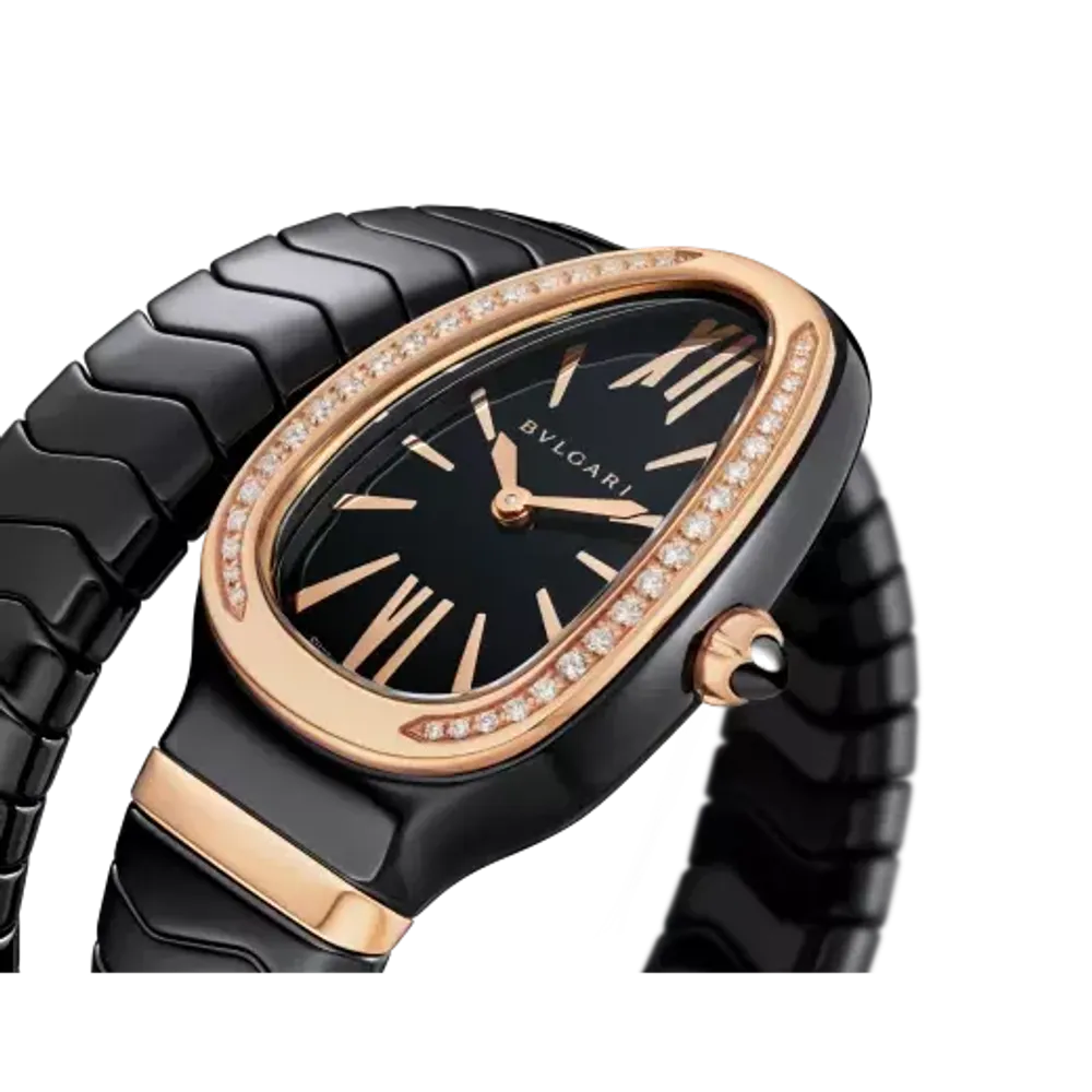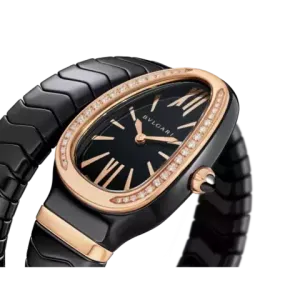 Часы Serpenti Tubogas с одной спиралью, корпус из нержавеющей стали, безель из розового золота 18 карат с бриллиантами классической огранки, опаловый циферблат из серебра, браслет из розового золота 18 карат и нержавеющей стали.