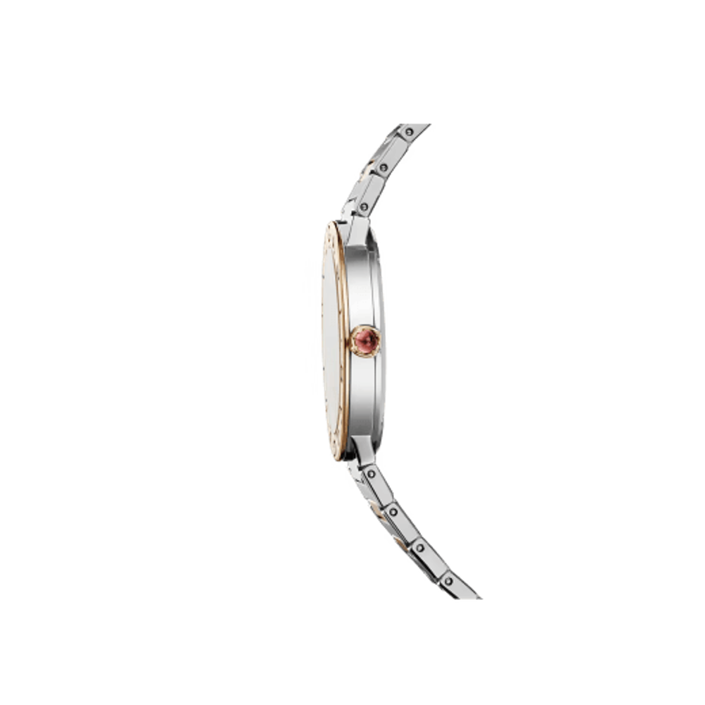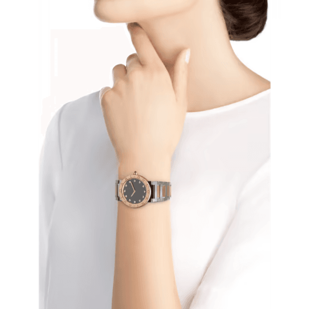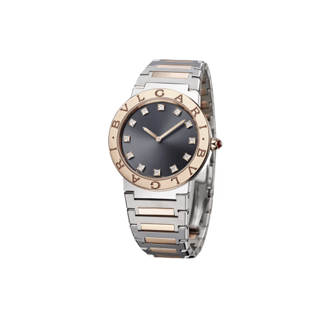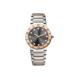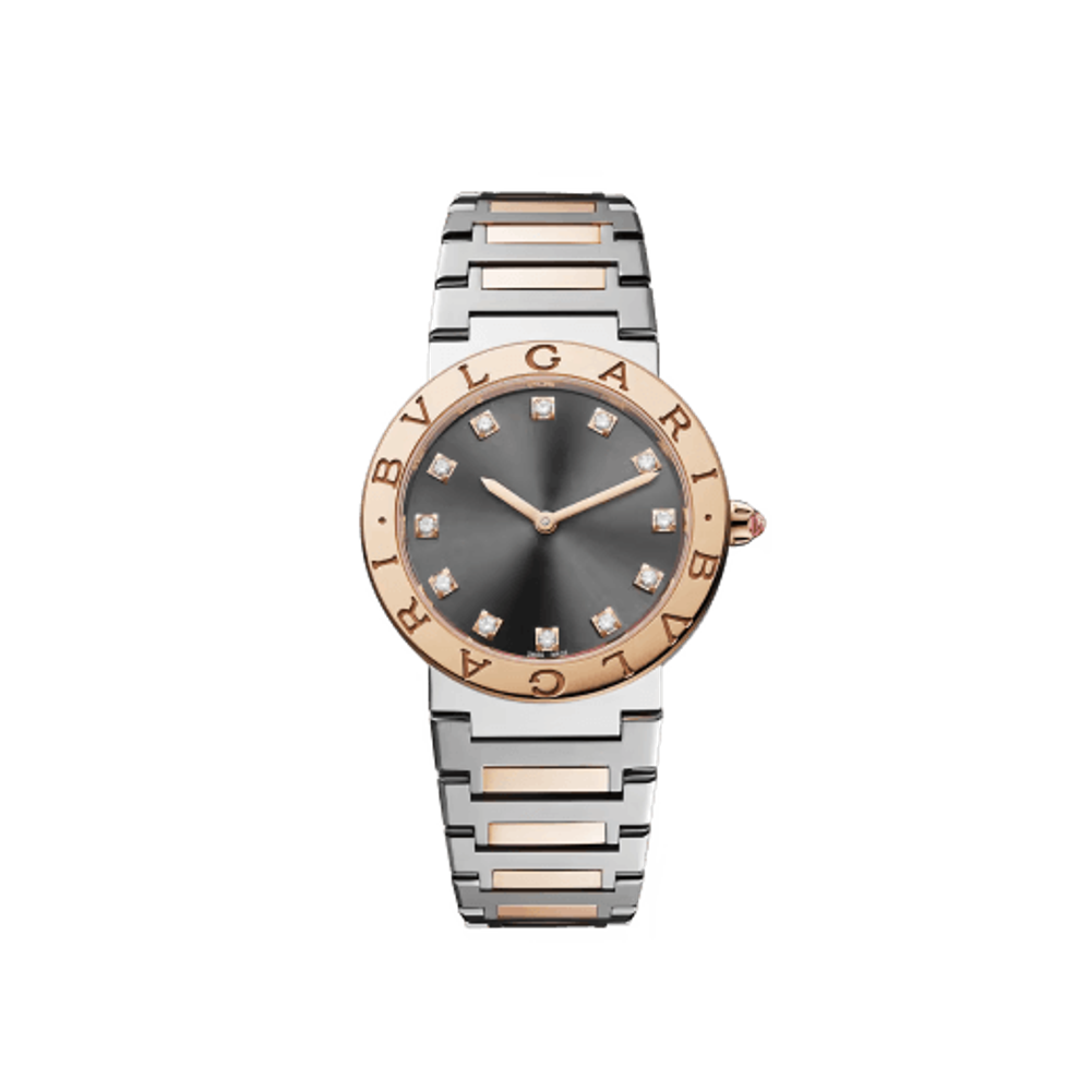 Вот уже более 40 лет Bvlgari создает инновационные модели, черпая вдохновение в классике прошлого. Коллекция BVLGARI BVLGARI – один из примеров творческой изобретательности и безупречного мастерства дома – стала первой в истории часовой коллекцией, в которой центральным элементом дизайна выступает логотип. Узнаваемая двойная круговая гравировка, навеянная изогнутыми надписями на старинных монетах и напоминающая о римском наследии Bvlgari, объединила в себе культурное достояние античной эпохи и современной эры. Предвосхитив сегодняшнюю тенденцию к повсеместному использованию логотипов, она стала подлинным воплощением блистательного стиля. Часы BVLGARI BVLGARI LADY, кварцевый механизм, корпус из нержавеющей стали, диаметр 33 мм, безель из розового золота 18 карат с логотипом, заводная головка из розового золота 18 карат с розовым камнем огранки кабошон, серый лакированный циферблат, бриллиантовые часовые метки, браслет из нержавеющей стали и розового золота 18 карат.
