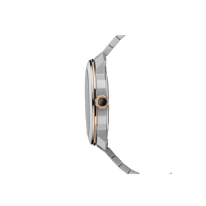 Заводная головка из розового золота 18 карат с керамической вставкой, антрацитовый циферблат, накладные вручную часовые метки, браслет из нержавеющей стали и раскладывающаяся застежка. Водонепроницаемость до 50 метров.