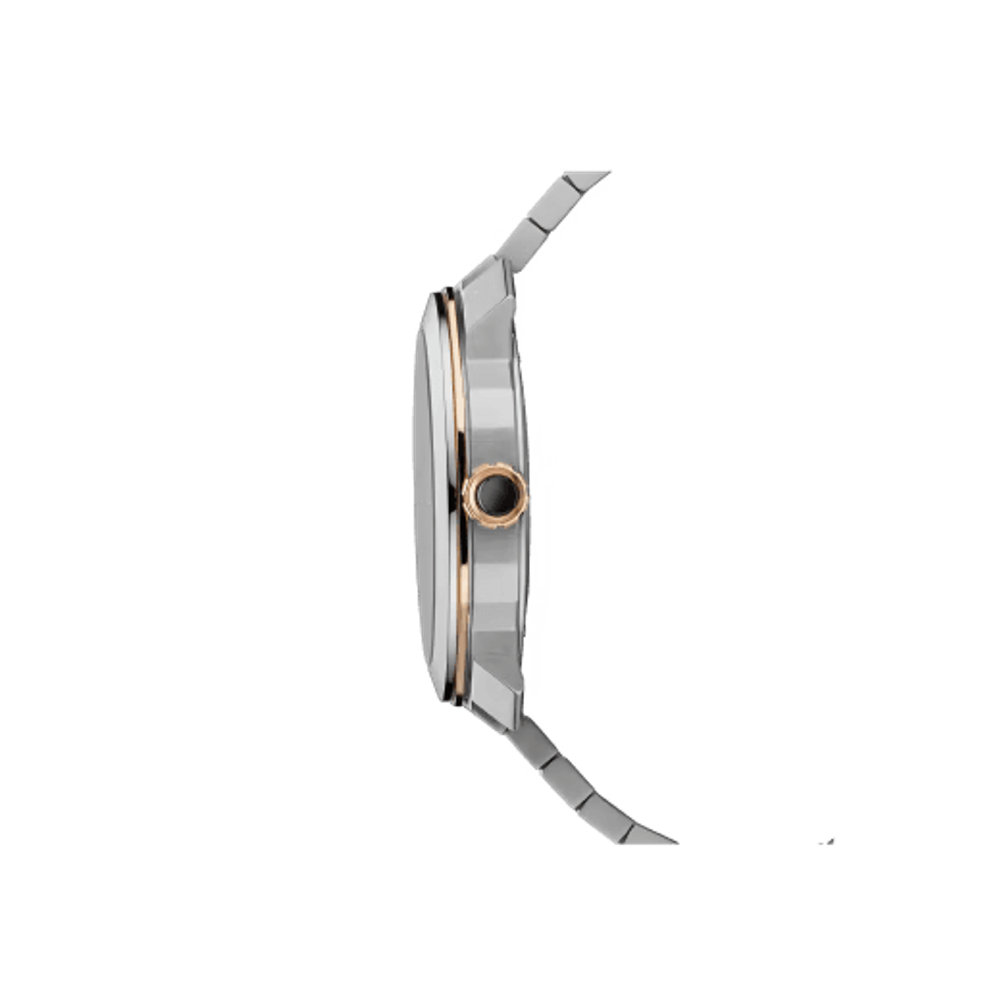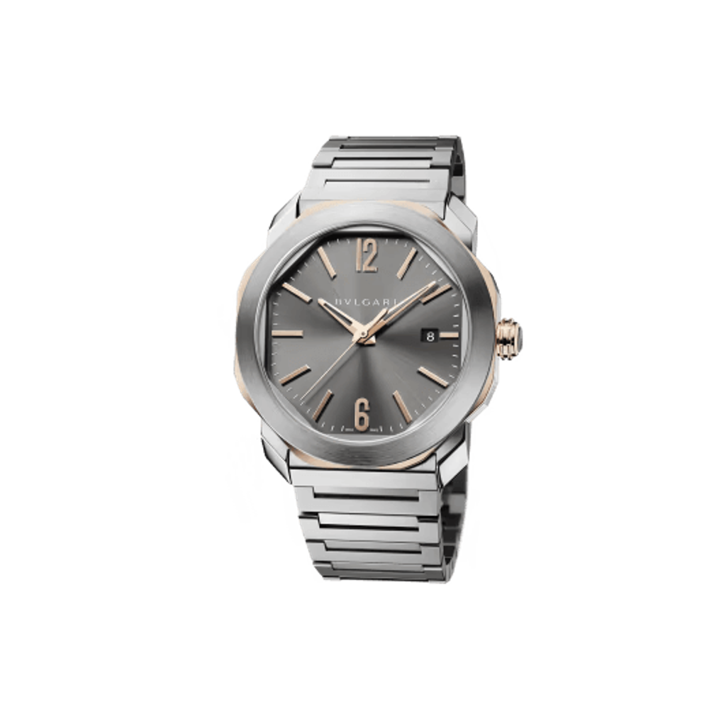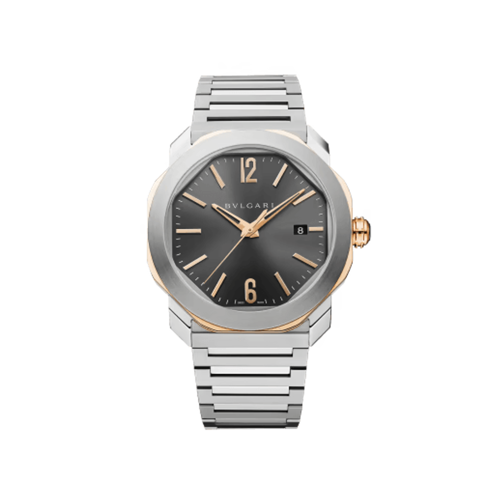 Часы Octo Roma с механизмом, автоматическим заводом, калибр BVL 191 - Solotempo, украшенный женевскими узорами, фаской и отделкой в форме улитки, запас хода 42 часа, корпус из нержавеющей стали диаметром 41 мм, восьмиугольник из розового золота 18 карат, прозрачная задняя крышка.