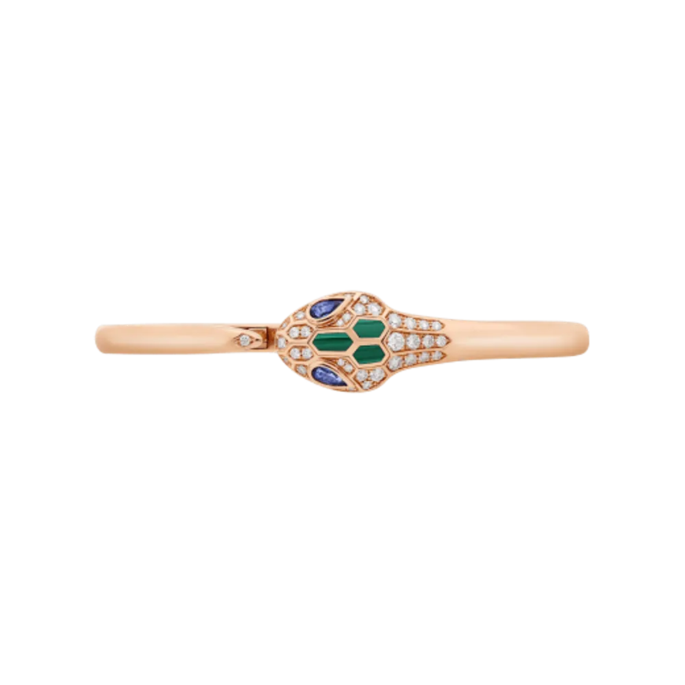 Излучая свойственную змее притягательность, браслет Serpenti делает акцент на голове легендарной рептилии, соединяя стилистическую смелость с безудержным соблазном. Черпая вдохновение в чувственности женских глаз, дом Bvlgari по-новому интерпретирует колдовское очарование змеи. В центре внимания – магнетизм взгляда и его неотразимая сила искушения. Это элегантность с оттенком опасности. Браслет Serpenti, розовое золото 18 карат, синие сапфиры, вставки из малахита, бриллиантовое паве.