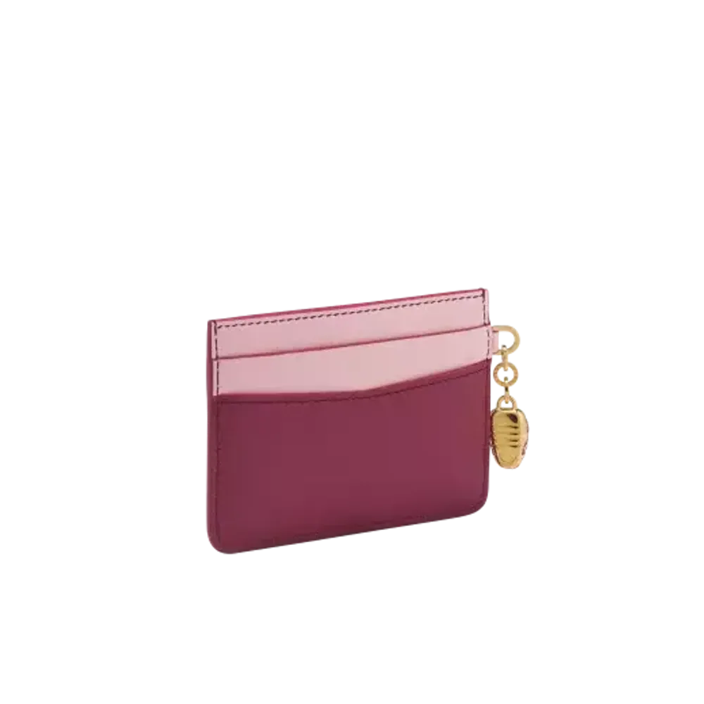 Футляр для кредитных карт Serpenti Forever из кожи теленка розовато-красного цвета оттенка анемоновой шпинели дополнен деталями из кожи наппа цвета розового кварца.
