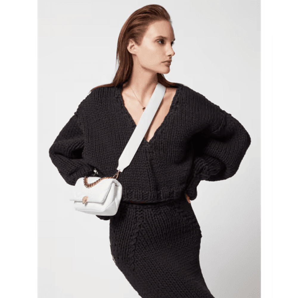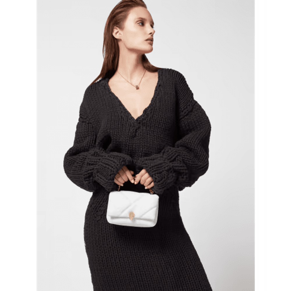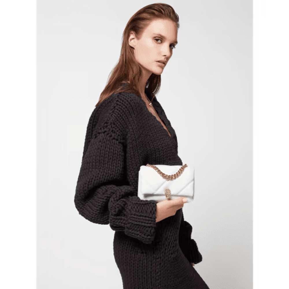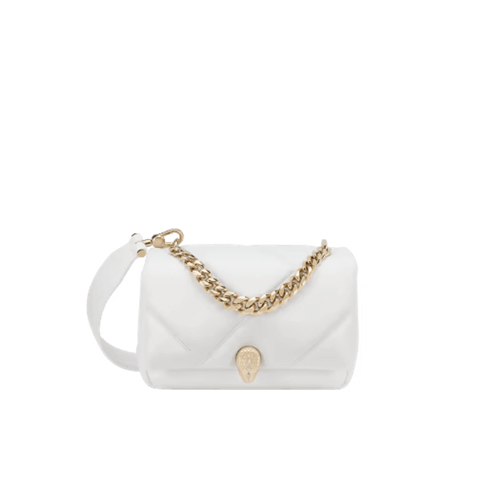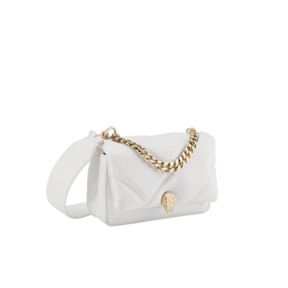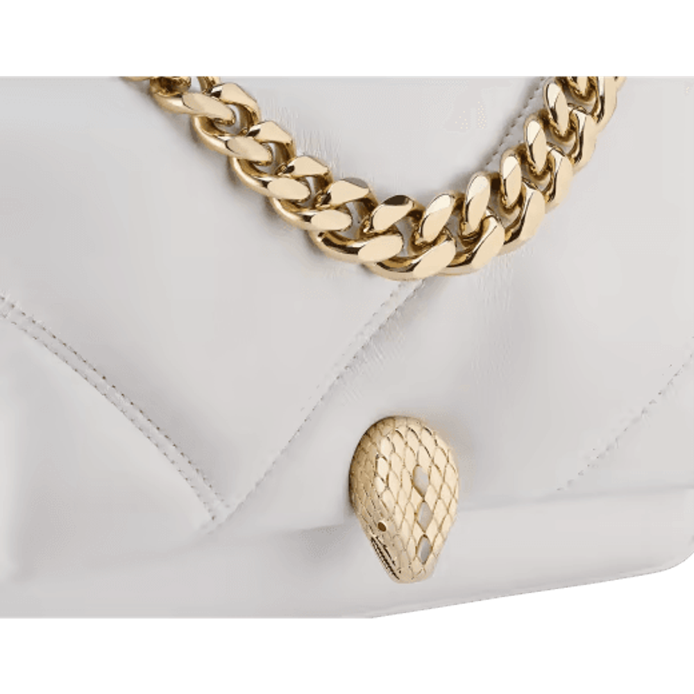 Мини-сумка через плечо Serpenti Cabochon Maxi Chain, выполненная из мягкой телячьей кожи цвета ромбовидного белого цвета с макси-матласным рисунком, вдохновленным извилистой поверхностью драгоценных камней огранки кабошон, сочетает в себе смелый графический мотив с очаровательными деталями. Оснащенное цепочкой, напоминающей о смелых ювелирных традициях Дома и подходящей в качестве ручки, творение увенчано традиционной магнитной застежкой в виде змеиной головы, украшенной драгоценными камнями, вдохновленной часами Bulgari 1960-х годов.