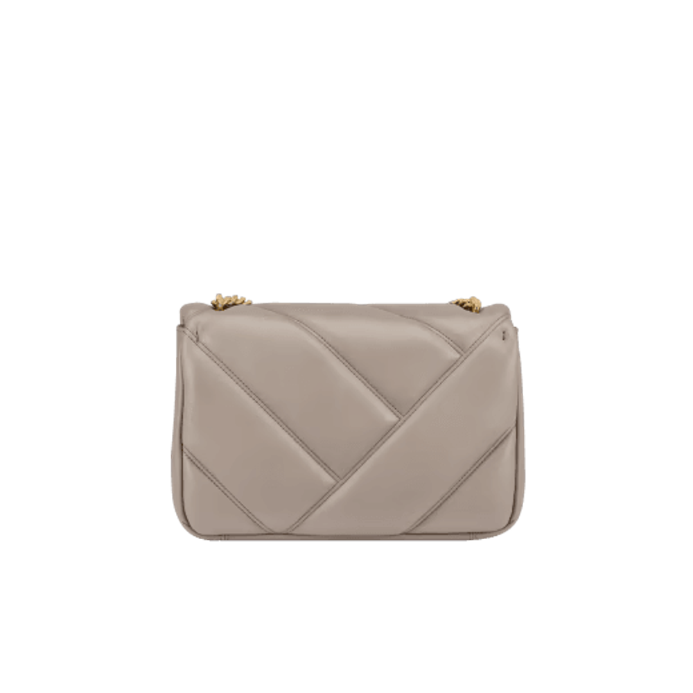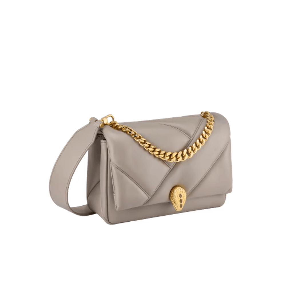 Маленькая сумка через плечо Serpenti Cabochon Maxi Chain выполнена из мягкой кожи теленка серого цвета туманного опала с крупным стеганым узором, навеянным плавными линиями драгоценных камней огранки кабошон. Смелый графичный мотив гармонично сочетается с эффектными деталями.