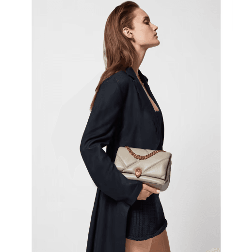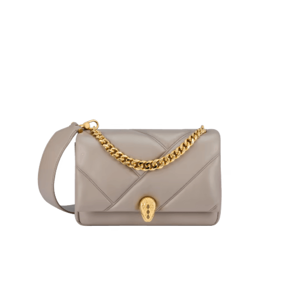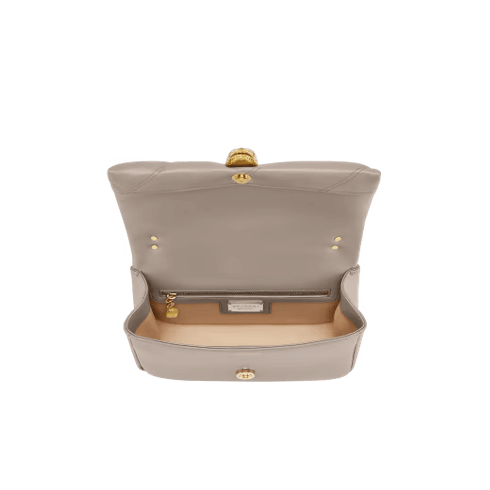 Ручка в форме цепочки напоминает смелые творения из ювелирных коллекций Дома, а декорированная драгоценными камнями магнитная застежка Heritage в виде змеиной головы – часы Bulgari 1960-х годов. Аксессуар дополнен кожаным ремешком и имеет одно отделение, один открытый карман и один карман на молнии внутри, прорезь для пластиковых карт, который украшает металлический ярлык с логотипом BULGARI.