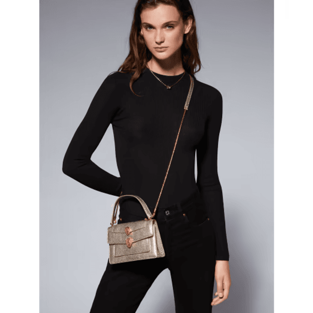 Стильная универсальная поясная сумка Serpenti Through the Eyes of Alexander Wang предлагает новое, оригинальное прочтение легендарного мотива змеи Bvlgari. Модель изготовлена вручную из роскошной кожи змеи карунг цвета светлого золота с узором Molten. Вдохновленный обликом часов Bvlgari Heritage 1960-х годов декор в виде двух змеиных голов Serpenti из латуни с покрытием цвета античного золота пленяет соблазнительным взором глаз из красной эмали. Сумка сочетает в себе функциональность и ультрасовременный дизайн. Она дополнена съемной верхней ручкой, цепочкой в виде змеи с кожаным ремешком и поясным ремнем, благодаря чему ее можно носить самыми разными способами. Передний карман, внешний карман с клапаном, внутренний открытый карман и тисненый логотип Alexander Wang BVLGARI внутри. 18,5 x 11,5 x 6,5 см. Сделано в Италии.