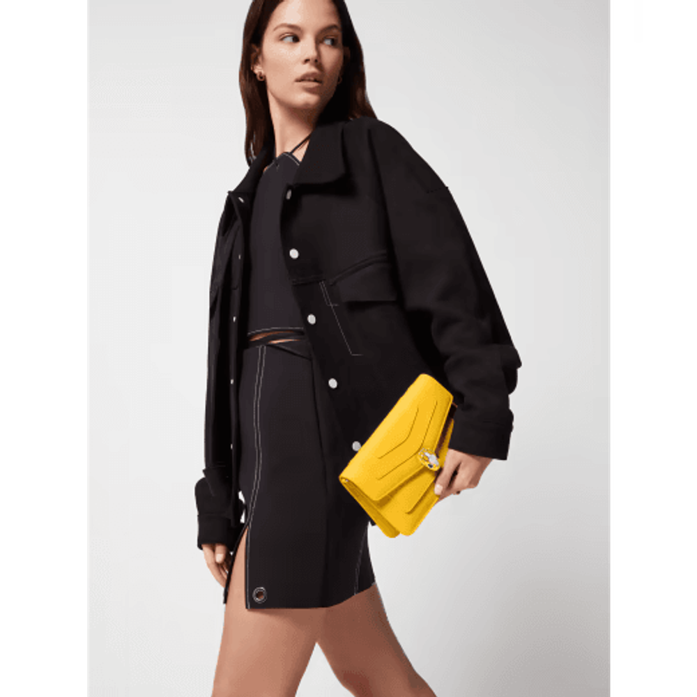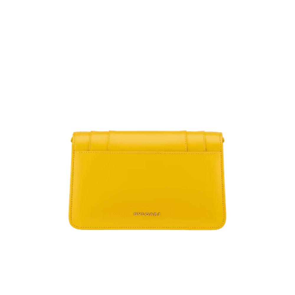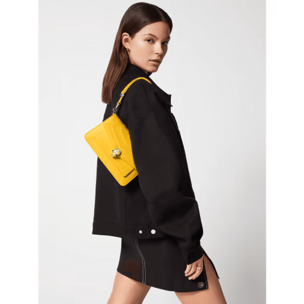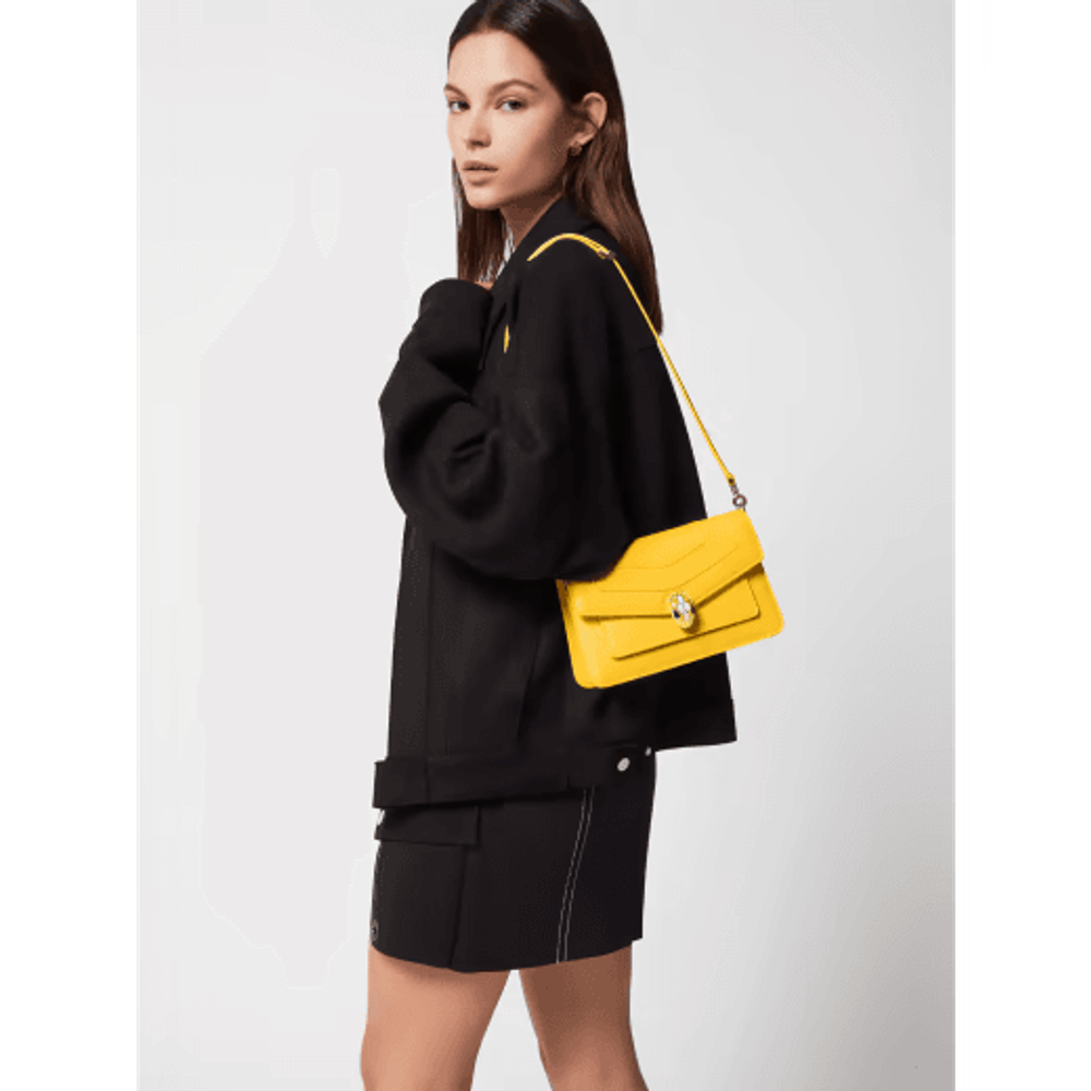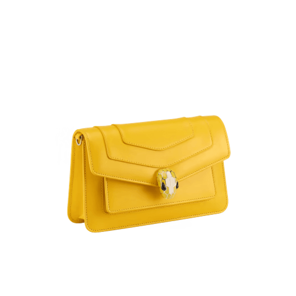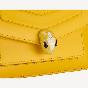 Маленькая сумка через плечо Serpenti Forever East-West из кожи теленка желтого цвета с подкладкой из льняной агатово-бежевой ткани в крупный рубчик. Очаровательная магнитная застежка в виде змеиной головы из латуни с покрытием из светлого золота, украшенная чешуйками из желтой и белой агатовой эмали, а также глаза из черного оникса.