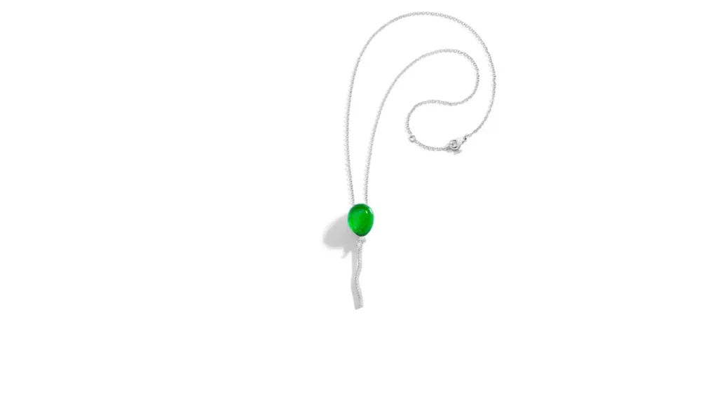Подвеска из белого золота 18 карат с родиевым покрытием, бриллиантами, жадеитом и горным хрусталем.