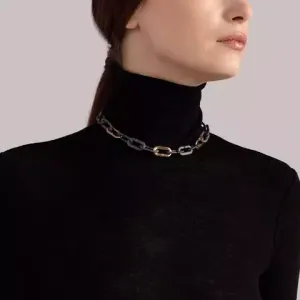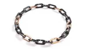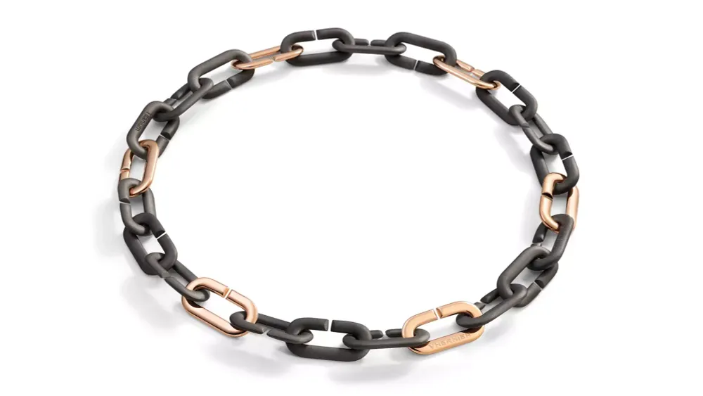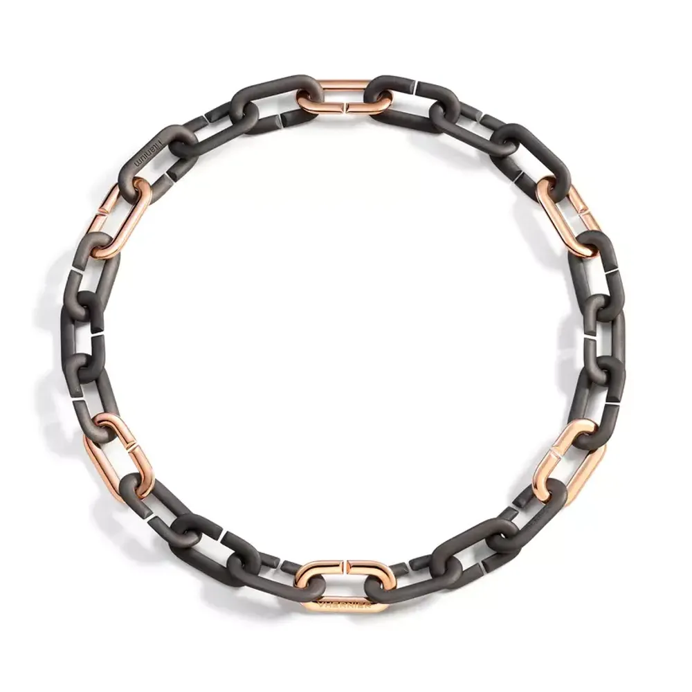 Цепь Mon Jeu из розового золота и титана с его чистыми линиями и смелыми комбинациями пересматривают классическую концепцию цепи. Разрез на каждом звене позволяет изменить порядок прикрепления элементов и добавить новые модули Mon Jeu. В своей версии с 24 соединенными элементами Mon Jeu представляет собой колье; благодаря игре в его совместной работе можно носить колье как 2 браслета, используя по 12 элементов каждый.