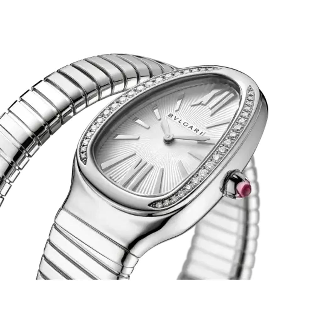 Дизайн часов Serpenti Tubogas вобрал в себя черты двух легендарных символов Bulgari: грацию извивающейся змеи и современный дух ювелирной техники tubogas. Вызывая в воображении и чувственные изгибы женского тела и упругие кольца змеи, часы поражают своей пластичностью и невесомостью благодаря ювелирной технике tubogas. Блистательные и поистине неповторимые, они знаменуют собой начало новой, захватывающей главы в истории непрерывной эволюции Serpenti. Часы Serpenti Tubogas, кварцевый механизм, изогнутый корпус из нержавеющей стали с бриллиантами классической огранки, диаметр 35 мм, заводная головка из нержавеющей стали с розовым рубеллитом огранки кабошон, серебристый опаловый циферблат, гильошированный узор «солнечные лучи», наложенные вручную часовые метки, браслет в один виток из нержавеющей стали.