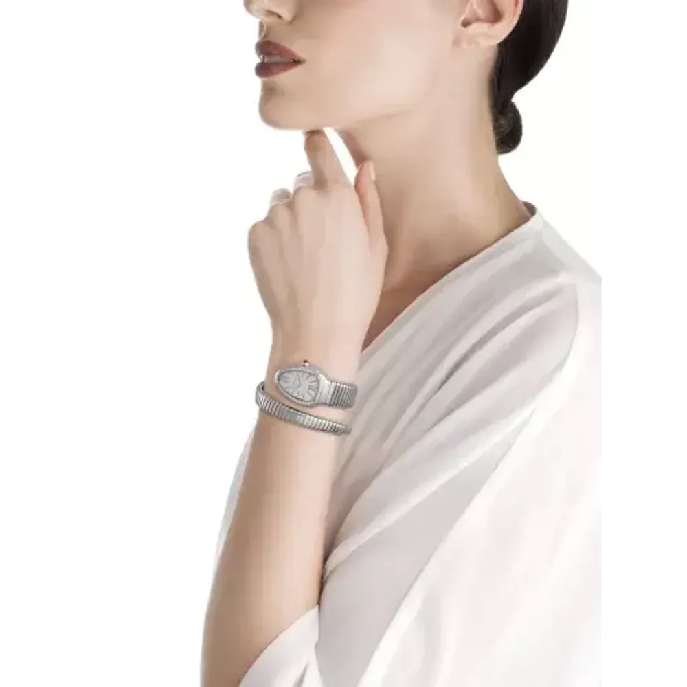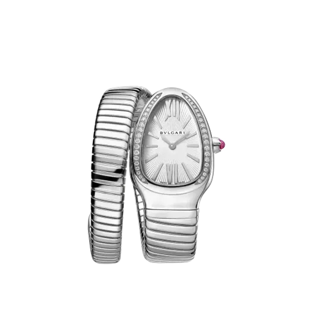 Часы Serpenti Tubogas, браслет в один виток и корпус из нержавеющей стали, безель с бриллиантами классической огранки, серебристый опаловый циферблат.