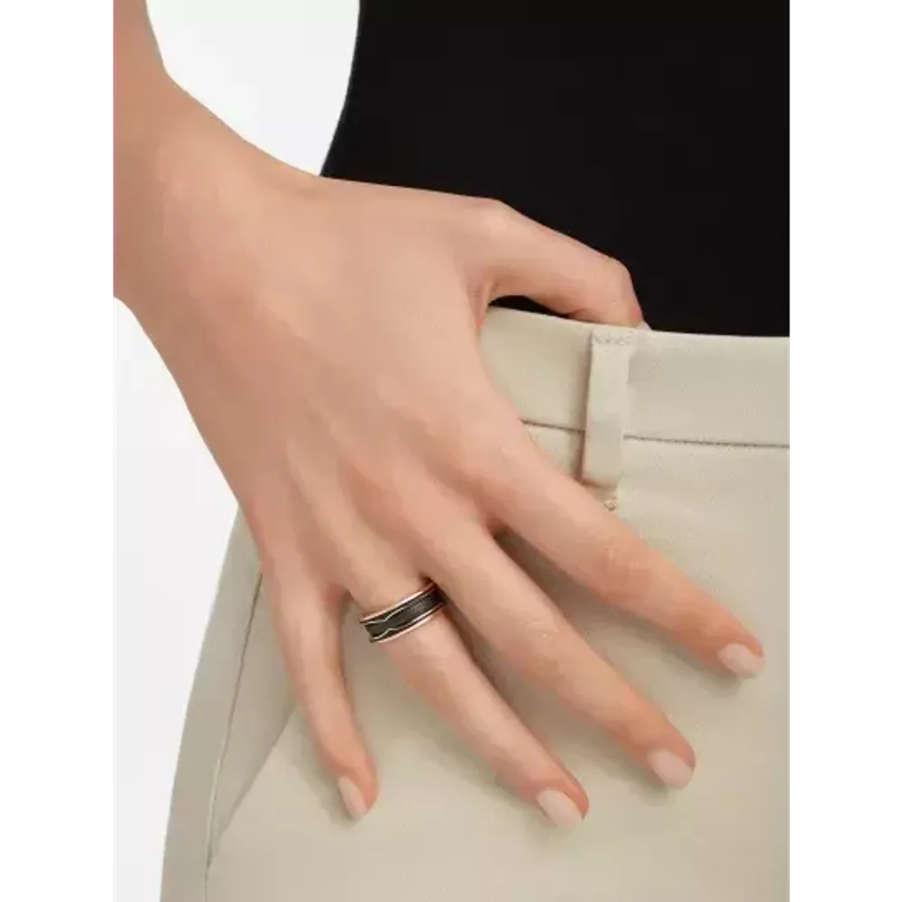 Навеянное самым известным амфитеатром, Колизеем, кольцо B.zero1 являет собой истинный манифест творческого видения Дома Bulgari, бросающего вызов устоям ювелирного дизайна. Чистые линии этой выразительной спирали символизируют гармоничную связь прошлого, настоящего и будущего, определяющую величественный облик Вечного города, и служат ярким выражением новаторского духа всей коллекции. Кольцо B.zero1 в две полосы, розовое золото 18 карат, металлокерамический сплав.