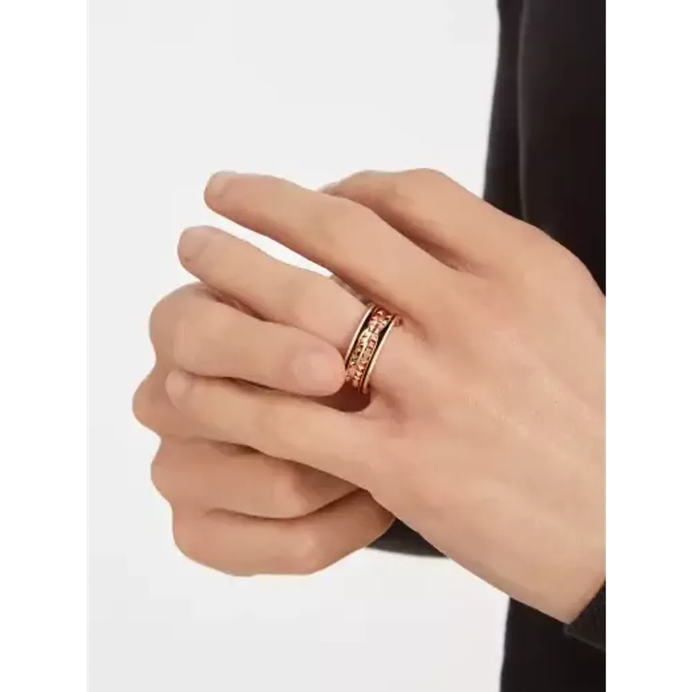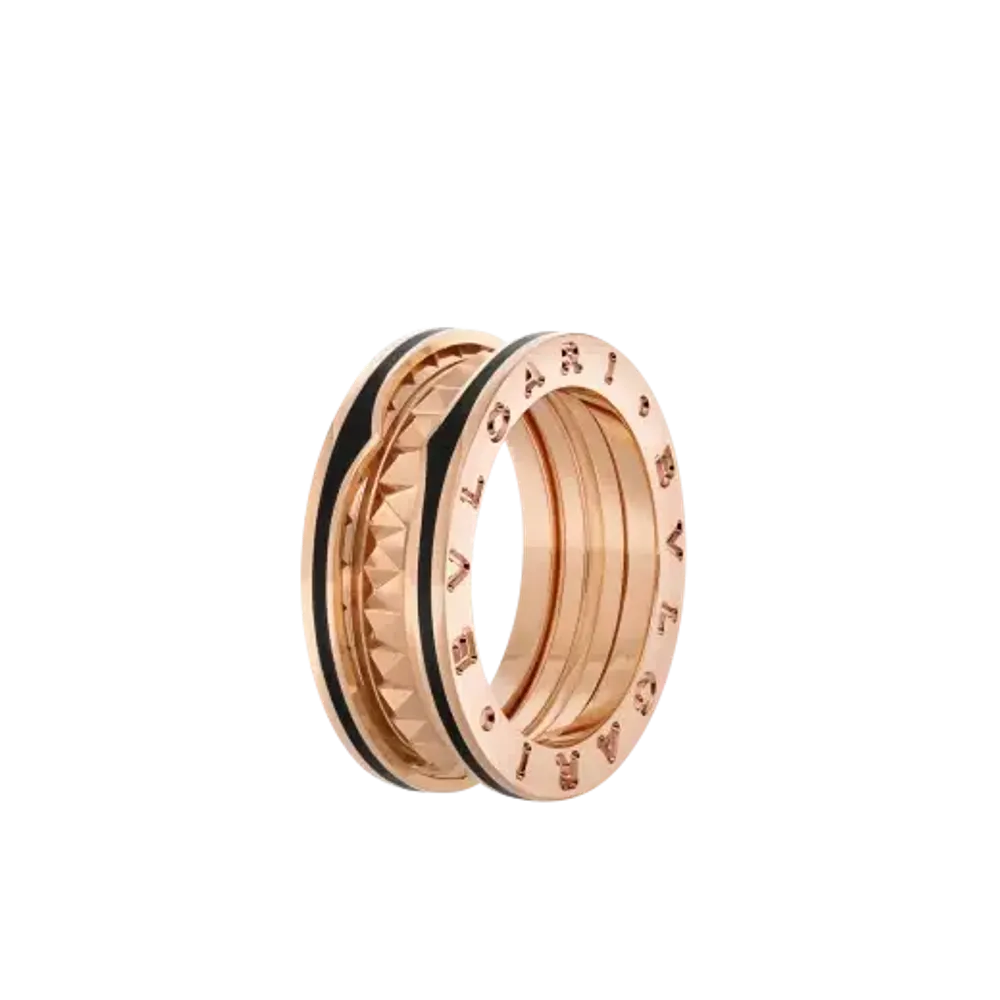 Коллекция B.zero1 Rock, вдохновленная архитектурой Колизея, самого известного амфитеатра в мире, являет собой подлинный манифест творческого видения дома Bvlgari с налётом дерзости. Изящная спираль, бросающая вызов устоям ювелирной эстетики, предстает в новой интерпретации, завораживая золотым сиянием заклепок и передавая самобытный и новаторский дух легендарного дизайна Bvlgari. Кольцо с четырьмя витками B.zero1 Rock, розовое золото 18 карат, черная керамика.