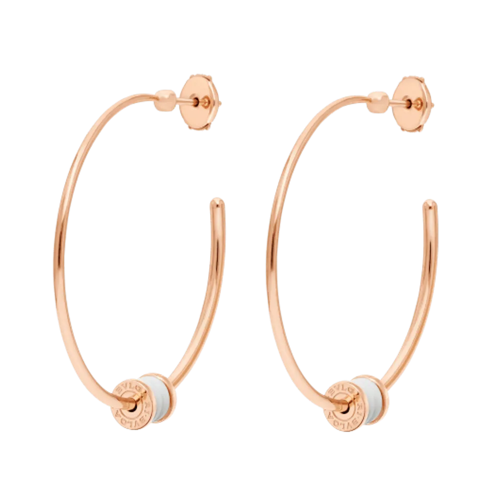 Навеянная самым известным амфитеатром – Колизеем, – коллекция B.zero1 являет собой подлинный манифест творческого видения дома Bvlgari и истинное воплощение итальянского дизайна. Изящная спираль, бросающая вызов устоям ювелирной эстетики, символизирует гармоничную связь прошлого, настоящего и будущего, определяющую величественный облик Вечного города, и служит ярким выражением новаторского духа всей коллекции. Серьги в виде колец B.zero1, розовое золото 18 карат, белая керамика, большая модель.