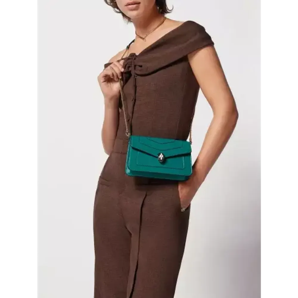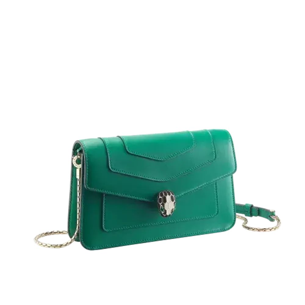 Кошелек на цепочке Serpenti Forever выполнен из кожи теленка изумрудно-зеленого цвета с внешней стороны и кожи наппа черного цвета с внутренней стороны. Аксессуар привлекает внимание эмблематичной застежкой в форме змеиной головы с гипнотическими разноцветными чешуйками и дизайном в стиле творений из ювелирной коллекции Serpenti 1960-х годов. Модель с цепочкой в виде змеи и кожаным ремешком имеет клапан с магнитной застежкой, внутренний карман на молнии, шесть прорезей для кредитных карт, один объемный карман, два кармана с клапанами и металлический логотип BULGARI сзади. 20 x 12 x 4 см. Сделано в Италии.
