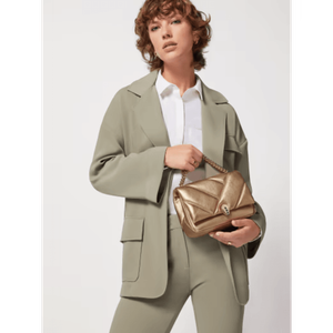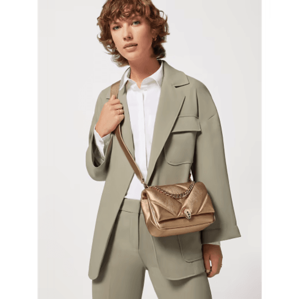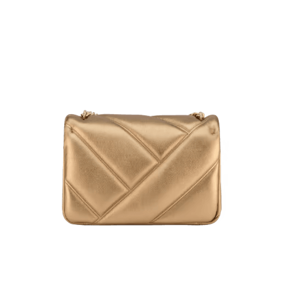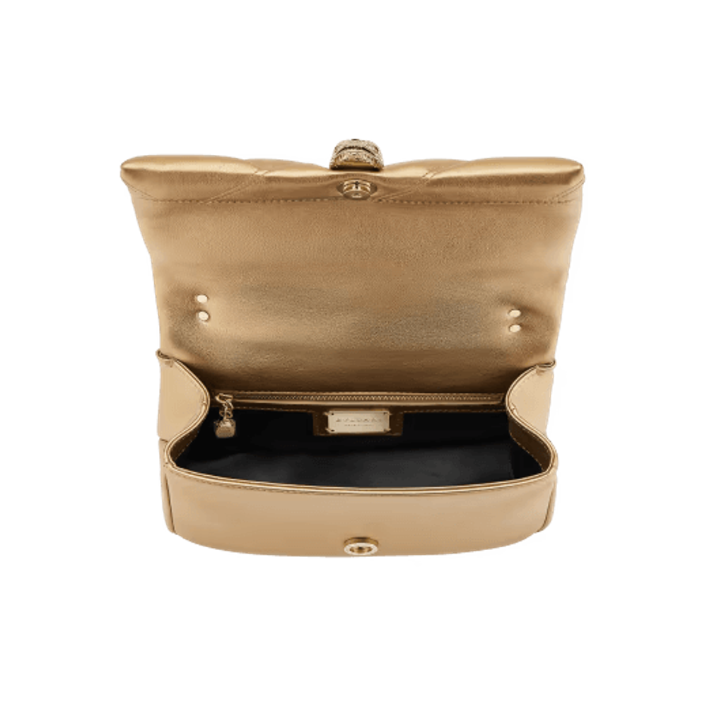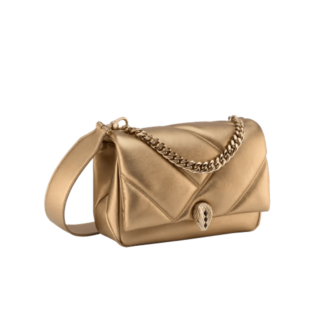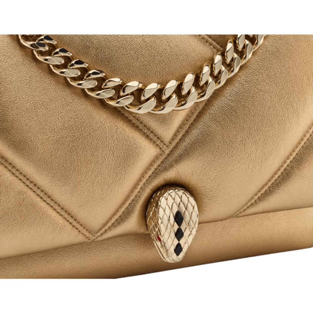 Маленькая сумка через плечо Serpenti Cabochon Maxi Chain из телячьей кожи Liquid Metal цвета золота с крупным графическим стеганым мотивом и подкладкой из черной кожи наппа. Очаровывает магнитной застежкой в виде змеиной головы из латуни с покрытием из светлого золота, чешуйками из черного оникса и глазами из красной эмали.