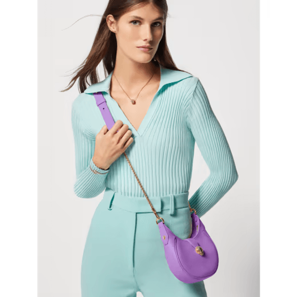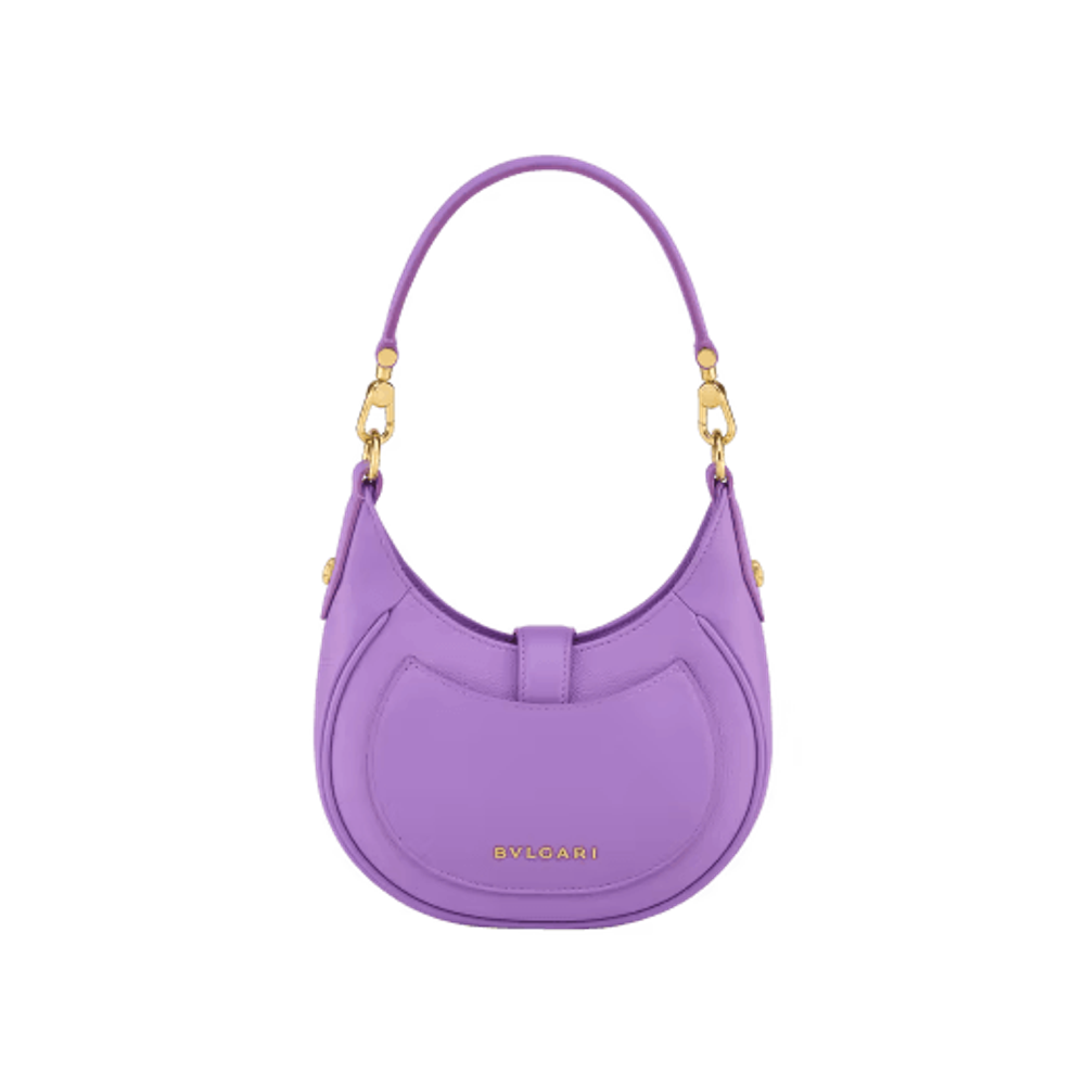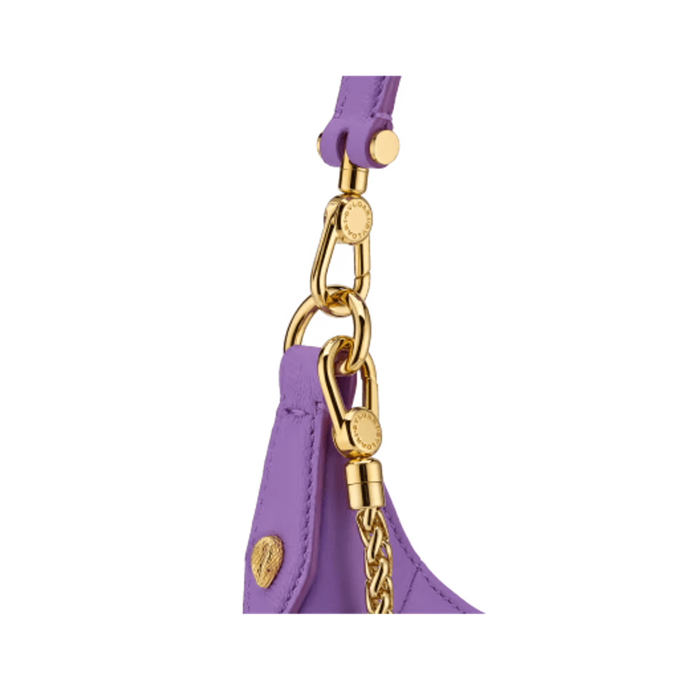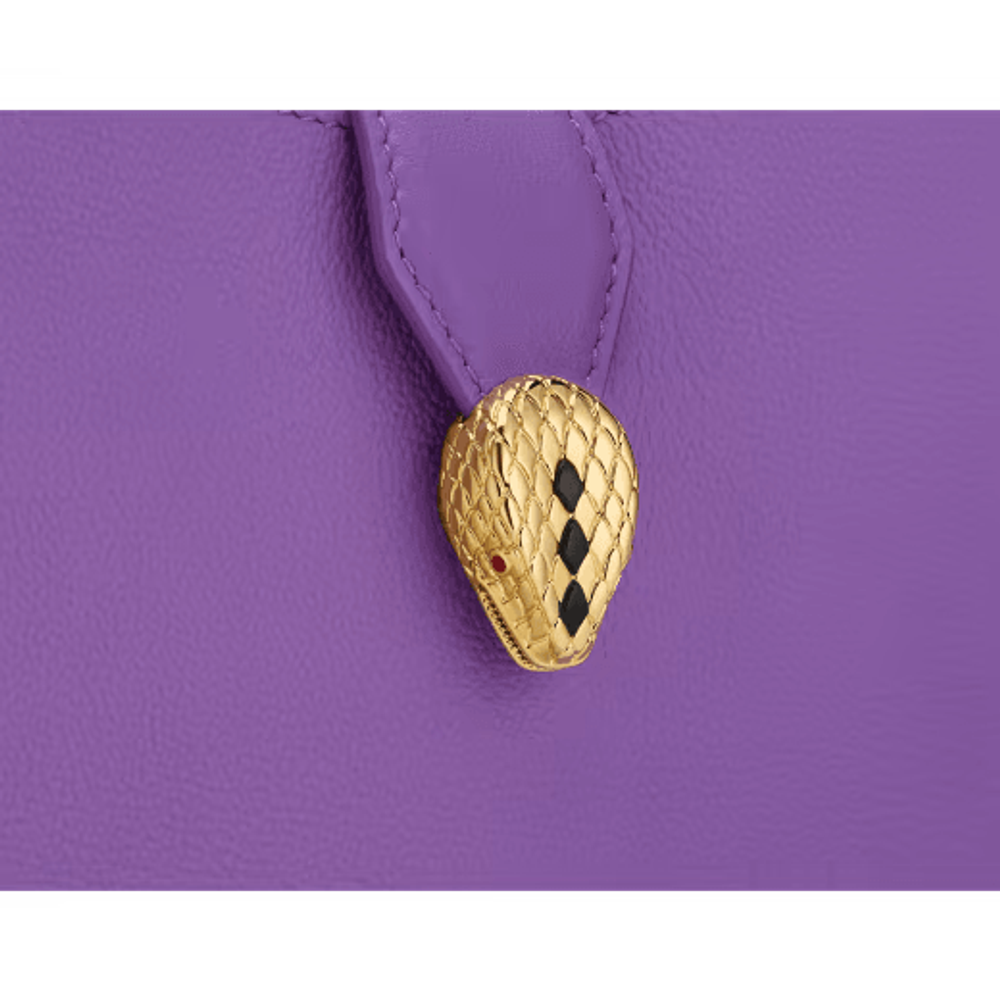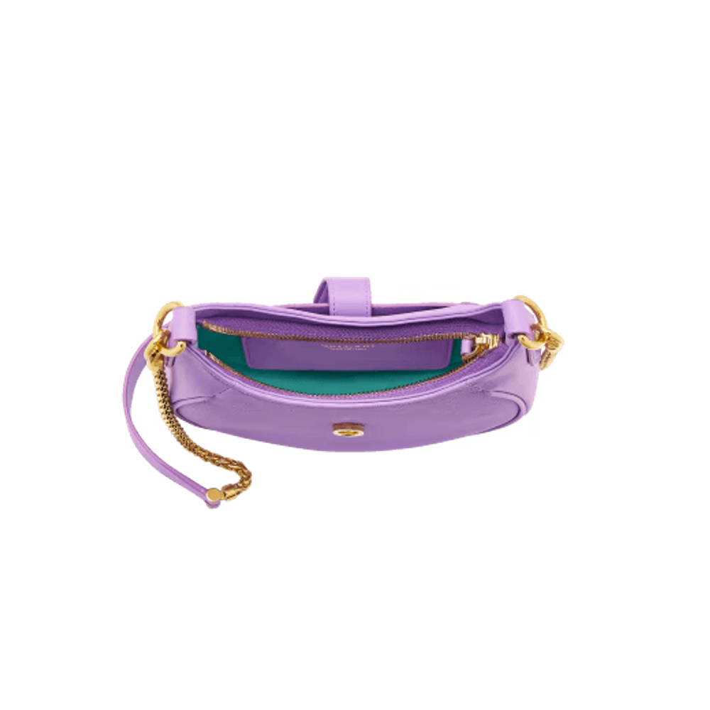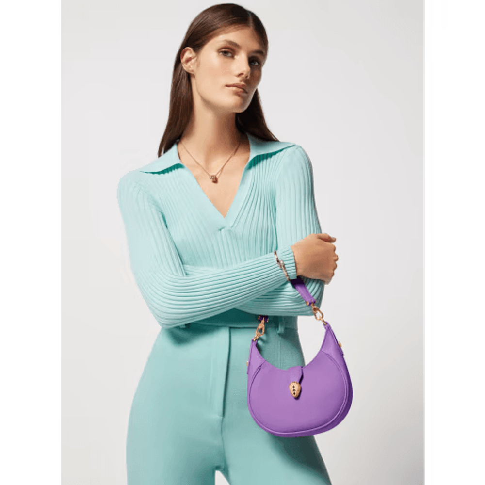 Маленькая сумка через плечо Serpenti Ellipse из прозрачной аметистово-сиреневой зернистой и гладкой телячьей кожи Urban с подкладкой из зеленовато-голубого репсового полотна.