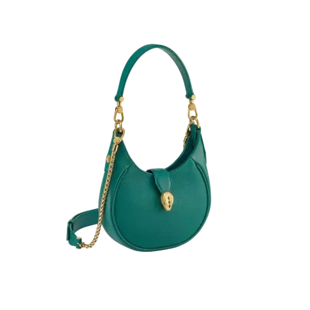 Маленькая сумка через плечо Serpenti Ellipse, обогащающая вселенную Serpenti Forever своей модной привлекательностью, отличается характерной формой, культовыми деталями и универсальностью. Его корпус из изумрудно-зеленой зернистой телячьей кожи Urban увенчан традиционной магнитной застежкой в виде змеиной головы, украшенной драгоценными камнями, вдохновленной часами Bulgari 1960-х годов.