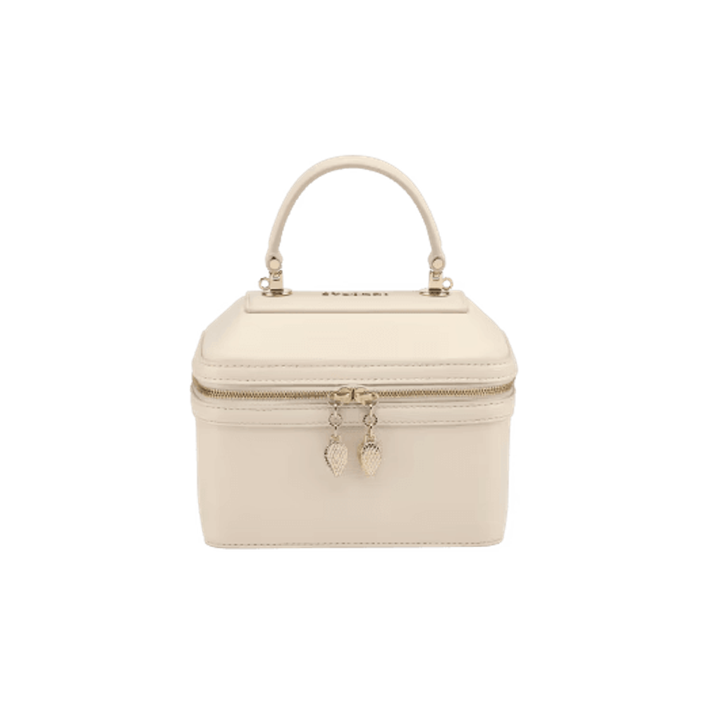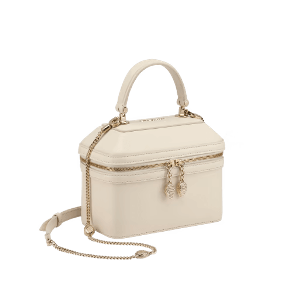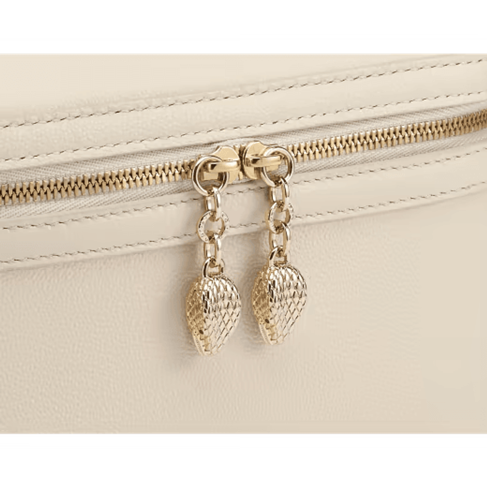 Сумка-сундучок Serpenti Forever из зернистой телячьей кожи цвета слоновой кости с подкладкой из черной кожи наппа. Очаровательные бегунки на молнии в виде головы змеи и ремешок-цепочка из латуни с покрытием из светлого золота.