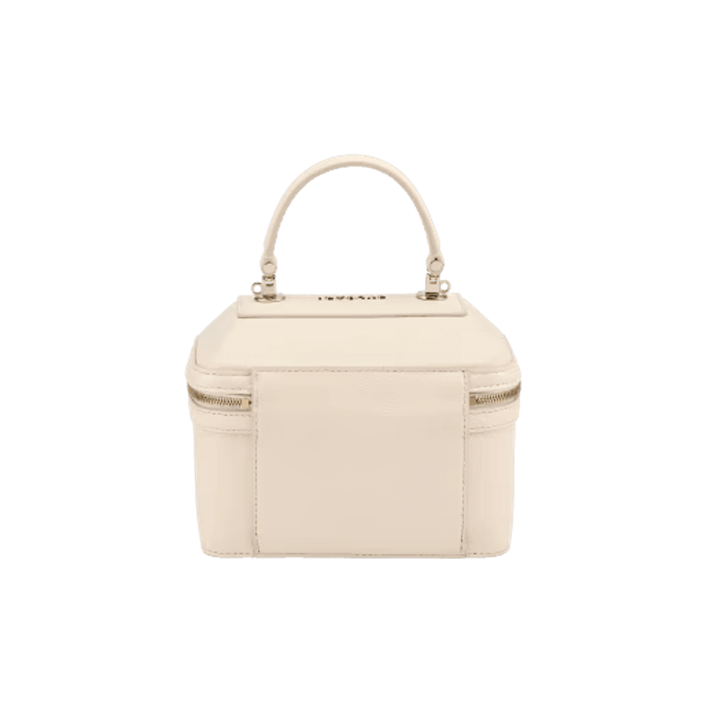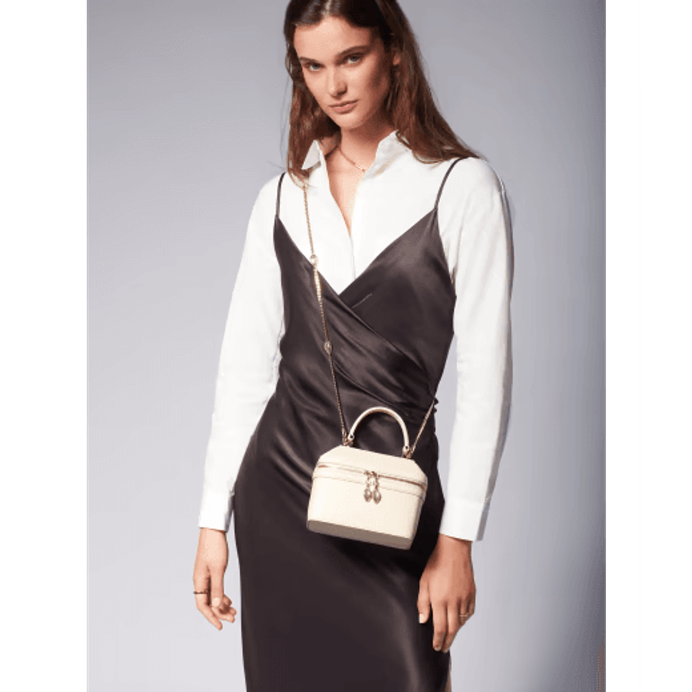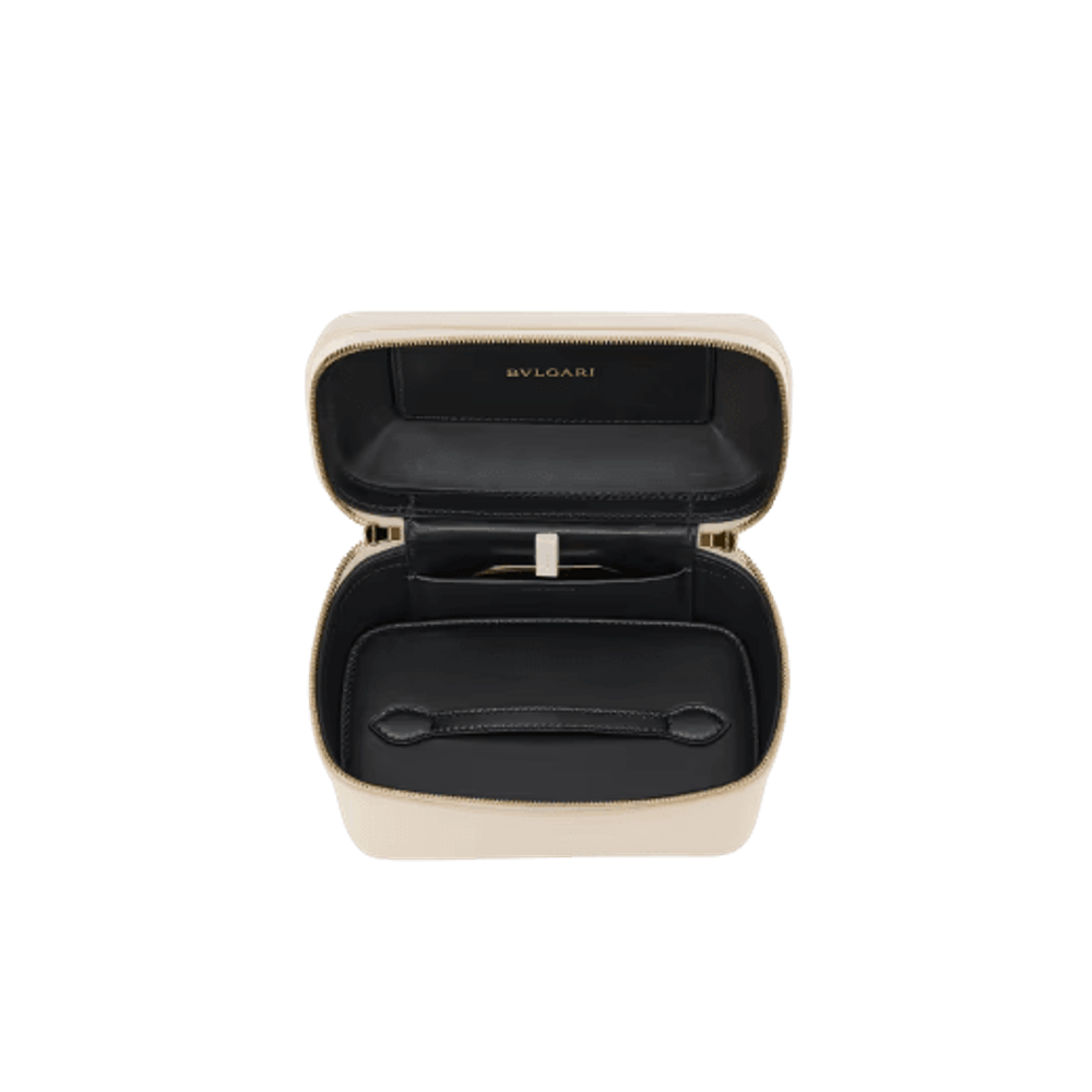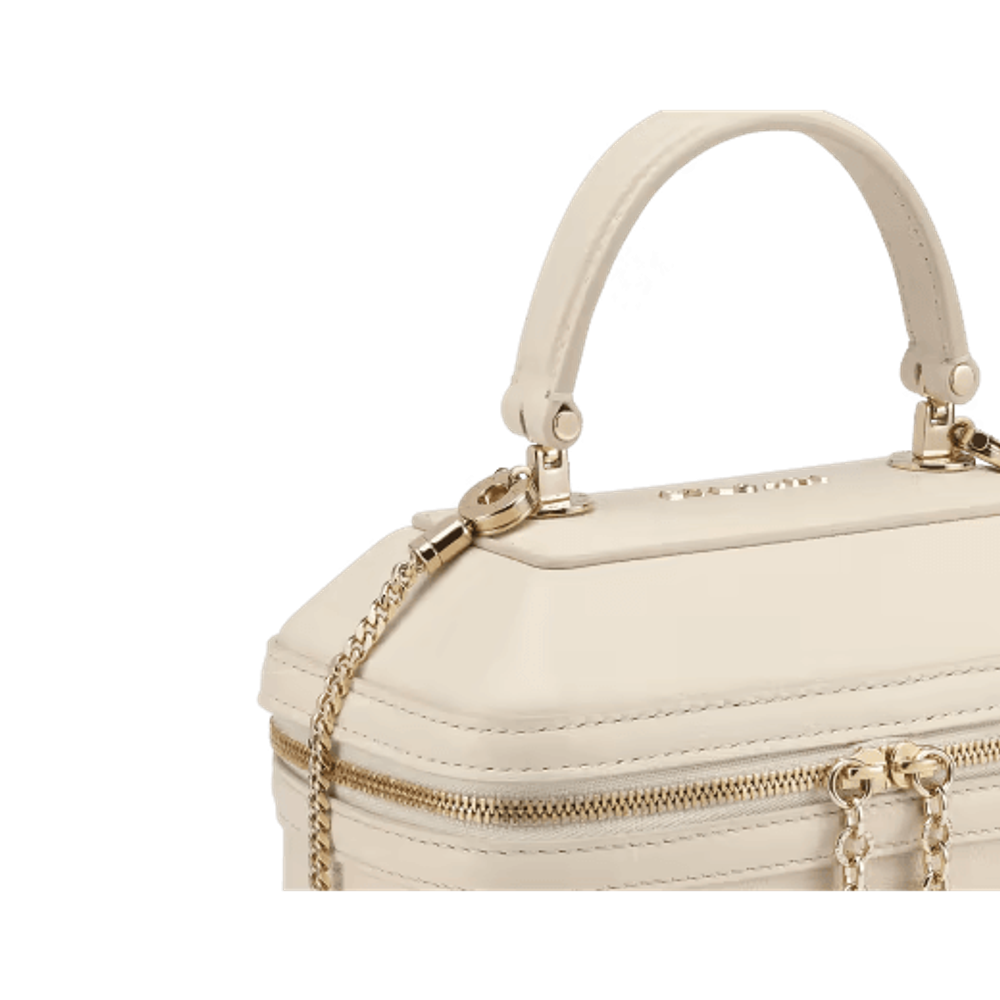 Сумка-сундучок Serpenti Forever из зернистой телячьей кожи цвета слоновой кости с подкладкой из черной кожи наппа. Очаровательные бегунки на молнии в виде головы змеи и ремешок-цепочка из латуни с покрытием из светлого золота.